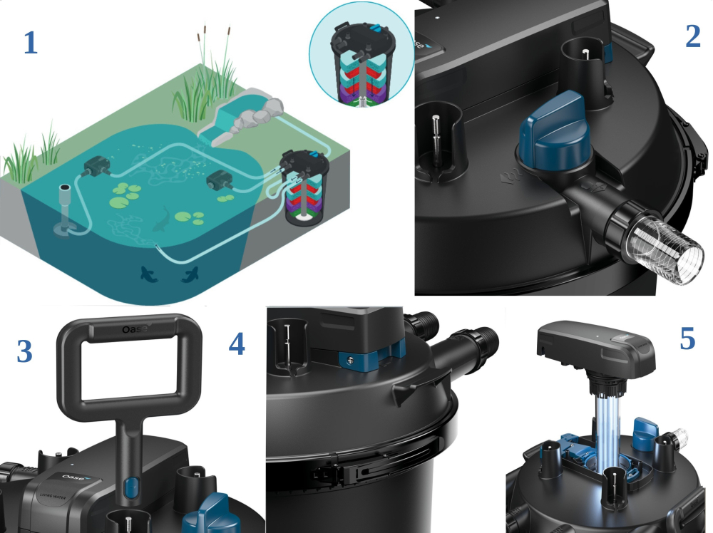 • Die integrierte OASE-Bypass-Technologie sorgt für optimalen Wasserdurchfluss und verhindert Verstopfungen des Filters