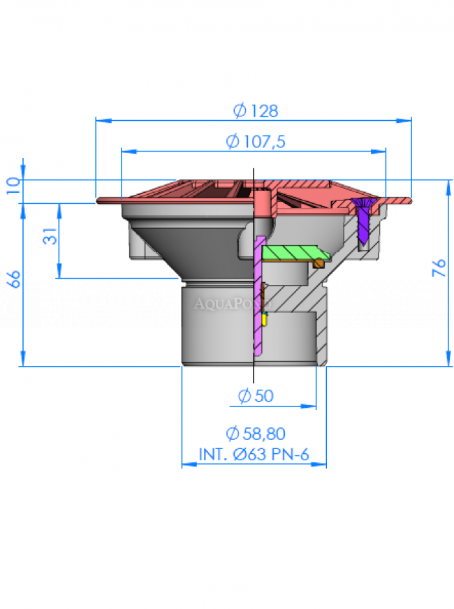Rezirkulations- und Saugdüse mit einstellbarem Durchfluss. Aus weißem oder farbigem ABS-Kunststoff. Befestigung des Gitters mit 4 Blechschrauben aus Edelstahl.
