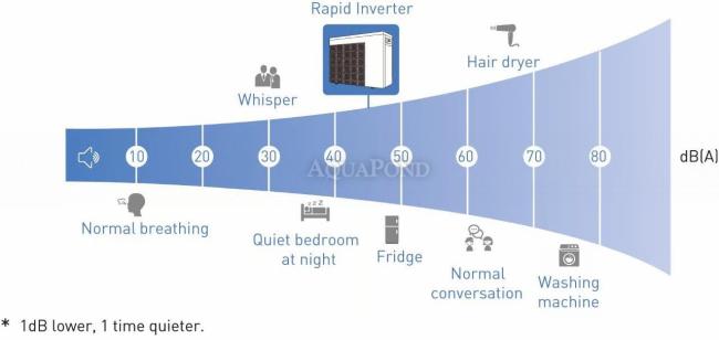 Wenn die Rapid Inverter mit mittlerer und niedriger Drehzahl läuft, um die Pooltemperatur zu halten, laufen Kompressor und Lüfter besonders leise. Der Rapid Inverter läuft im Durchschnitt mit einem COP von bis zu 16 (bei Luft 26°C/Wasser 26°C/Luftfeuchtigkeit 80%), abhängig von der Poolgröße. Bei niedriger Geschwindigkeit sind Inverter-Kompressoren äußerst geräuscharm, liefern optimale Ergebnisse und haben eine längere Lebensdauer.