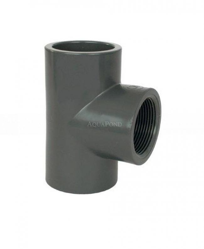 PVC-T-Stück 90° mit zwei gleichgroßen Klebemuffen (gegenüberliegend) und einem Innengewinde (Abzweig). Bei dem Gewinde handelt es sich um das in der Wassertechnik standardmäßig zum Einsatz kommende Whitworthgewinde, welches eine einfache Kombination mit Gewindefittings aus anderen Materialien ermöglicht. So kann ein Übergang auf ein Metallrohr problemlos umgesetzt werden.